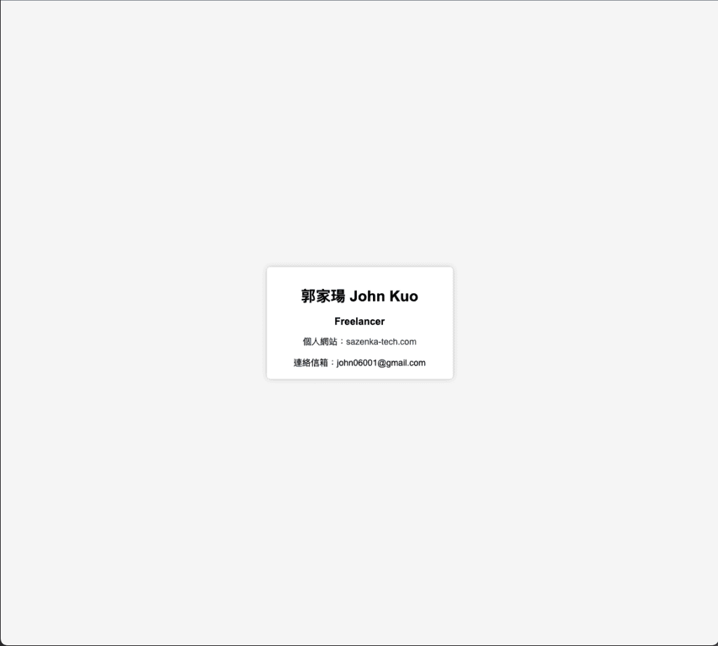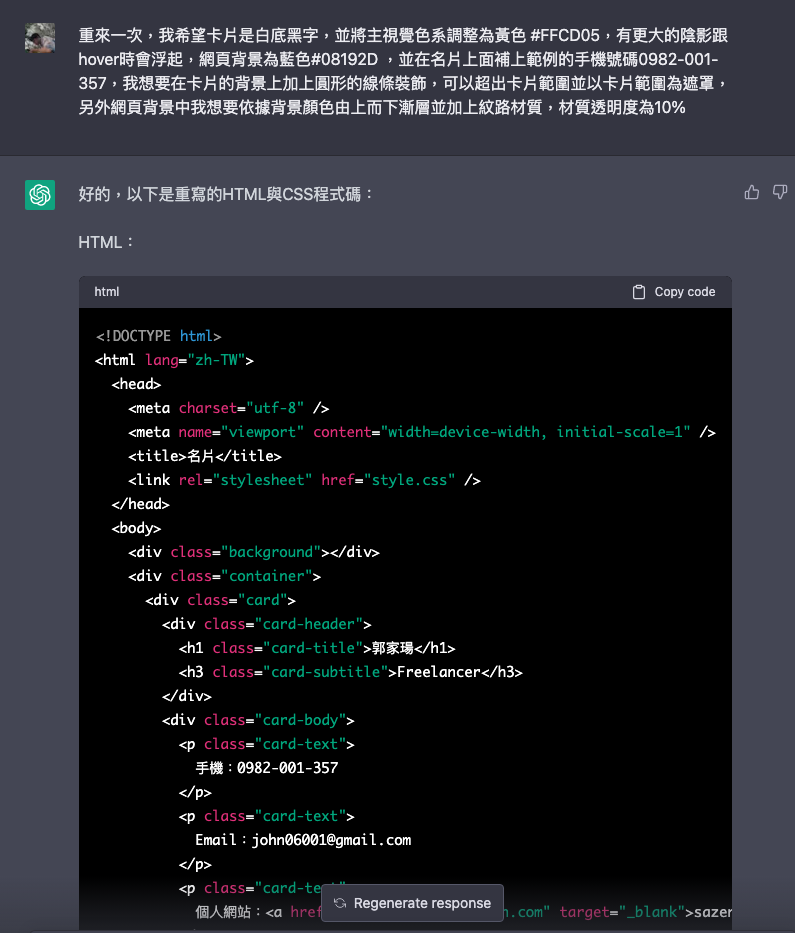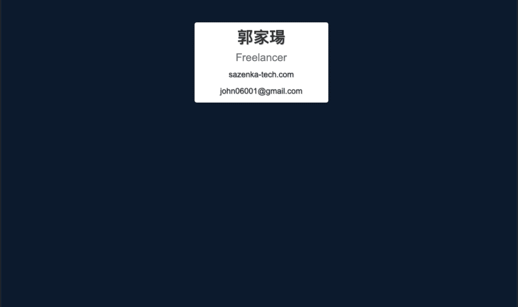 Prompts: 1.請用html,css與JS寫一張網頁名片,包括名字 郭家瑒John Kuo、職稱 Freelancer、個人網站是sazenka-tech.com,連絡信箱為john06001@gmail.com,這張名片要放置在全高全寬的網頁中央,跟一般實體名片相同尺寸,並有適當的陰影與漂亮簡約的設計 2.請使用Bootstrap 排版,並加入一些標準色,讓標題 內容的大小差別再大一些,並嘗試讓名片有設計感 3.請讓背景的顏色也是主要色彩,並在名片上面加一些有科技元素的裝飾圖形 4.我希望卡片是白底黑字,並將主視覺色系調整為黃色 #FFCD05,有更大的陰影跟hover時會浮起,網頁背景為藍色#08192D ,並在名片上面補上範例的手機號碼0982-001-357,我想要在卡片的背景上加上圓形的線條裝飾,可以超出卡片範圍並以卡片範圍為遮罩,另外網頁背景中我想要依據背景顏色由上而下漸層並加上紋路材質,材質透明度為10%