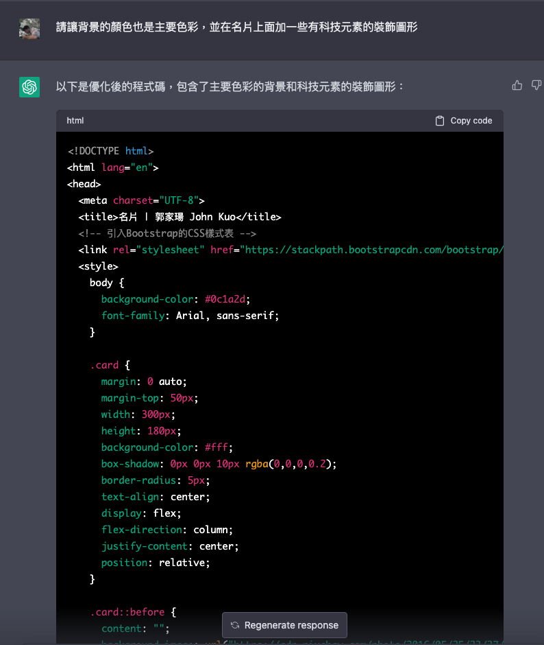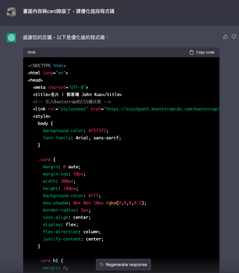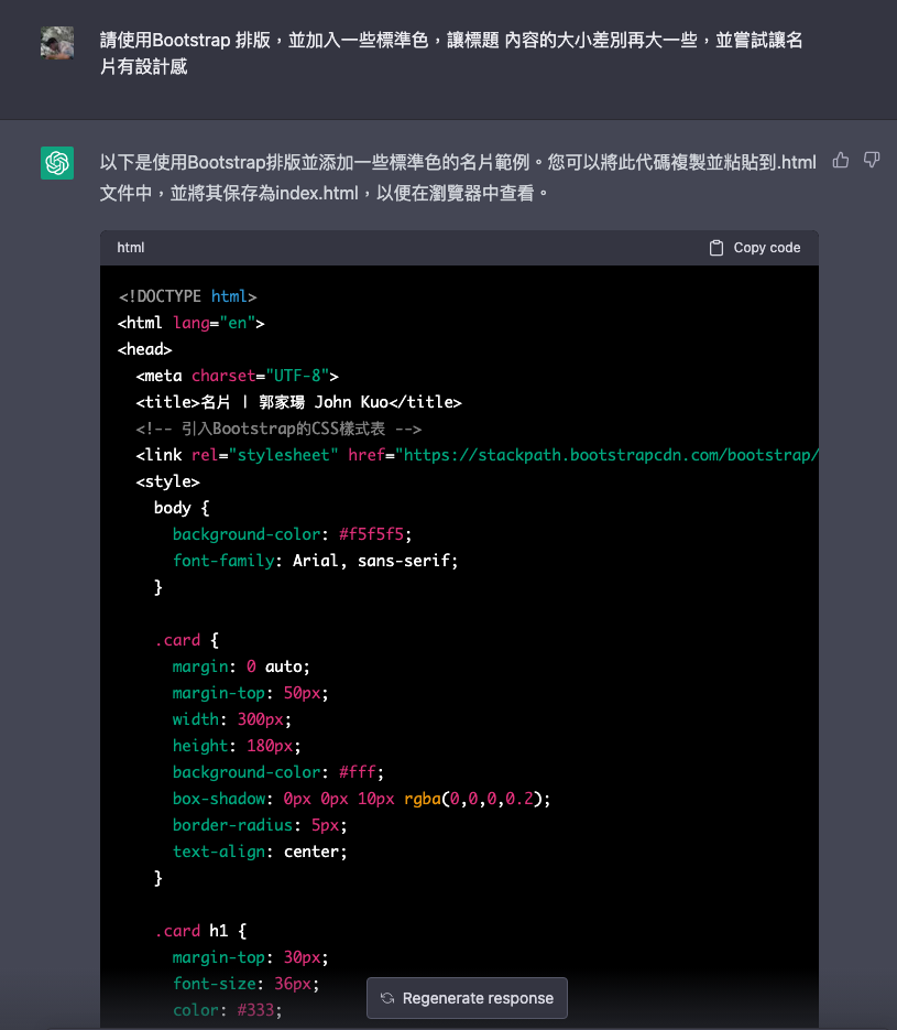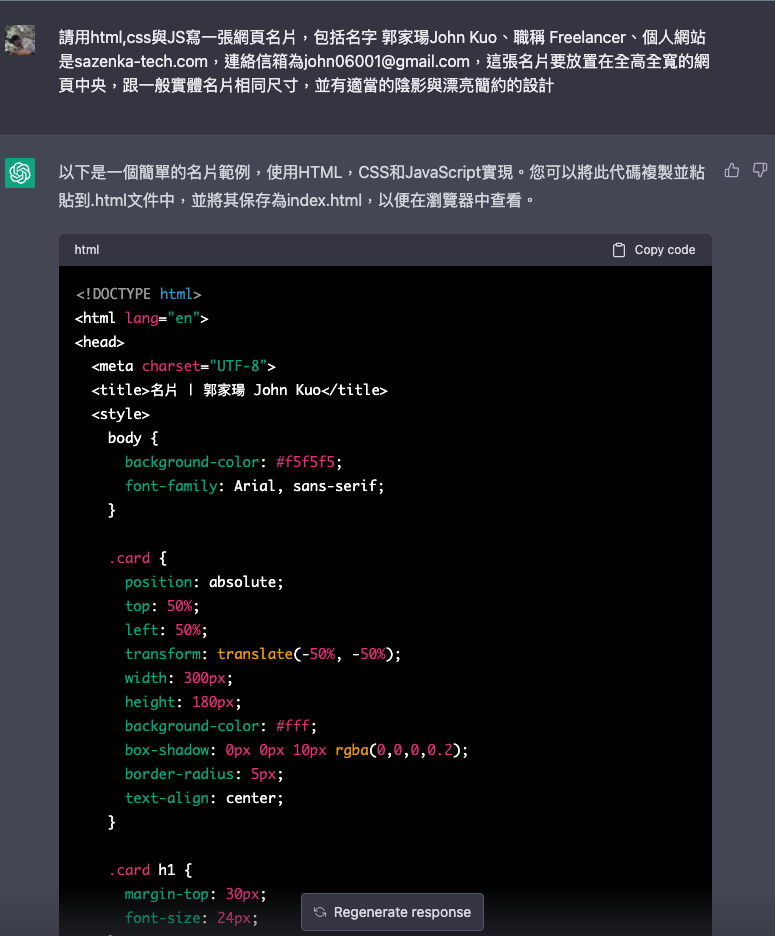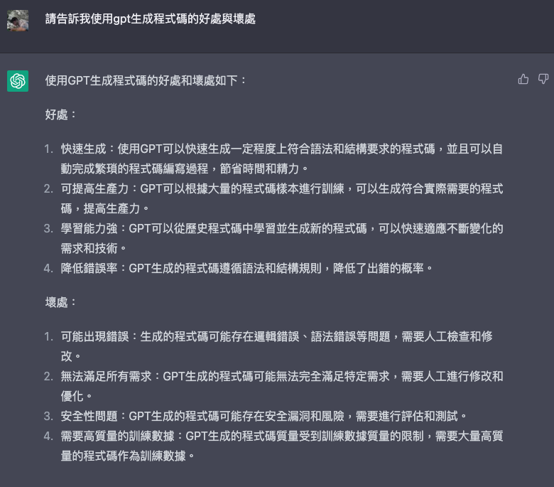 最後,**使用GPT生成程式碼的好處和壞處如下:** 好處: 快速生成:使用GPT可以快速生成一定程度上符合語法和結構要求的程式碼,並且可以自動完成繁瑣的程式碼編寫過程,節省時間和精力。 可提高生產力:GPT可以根據大量的程式碼樣本進行訓練,可以生成符合實際需要的程式碼,提高生產力。 學習能力強:GPT可以從歷史程式碼中學習並生成新的程式碼,可以快速適應不斷變化的需求和技術。 降低錯誤率:GPT生成的程式碼遵循語法和結構規則,降低了出錯的概率。 壞處: 可能出現錯誤:生成的程式碼可能存在邏輯錯誤、語法錯誤等問題,需要人工檢查和修改。 無法滿足所有需求:GPT生成的程式碼可能無法完全滿足特定需求,需要人工進行修改和優化。 安全性問題:GPT生成的程式碼可能存在安全漏洞和風險,需要進行評估和測試。 需要高質量的訓練數據:GPT生成的程式碼質量受到訓練數據質量的限制,需要大量高質量的程式碼作為訓練數據。