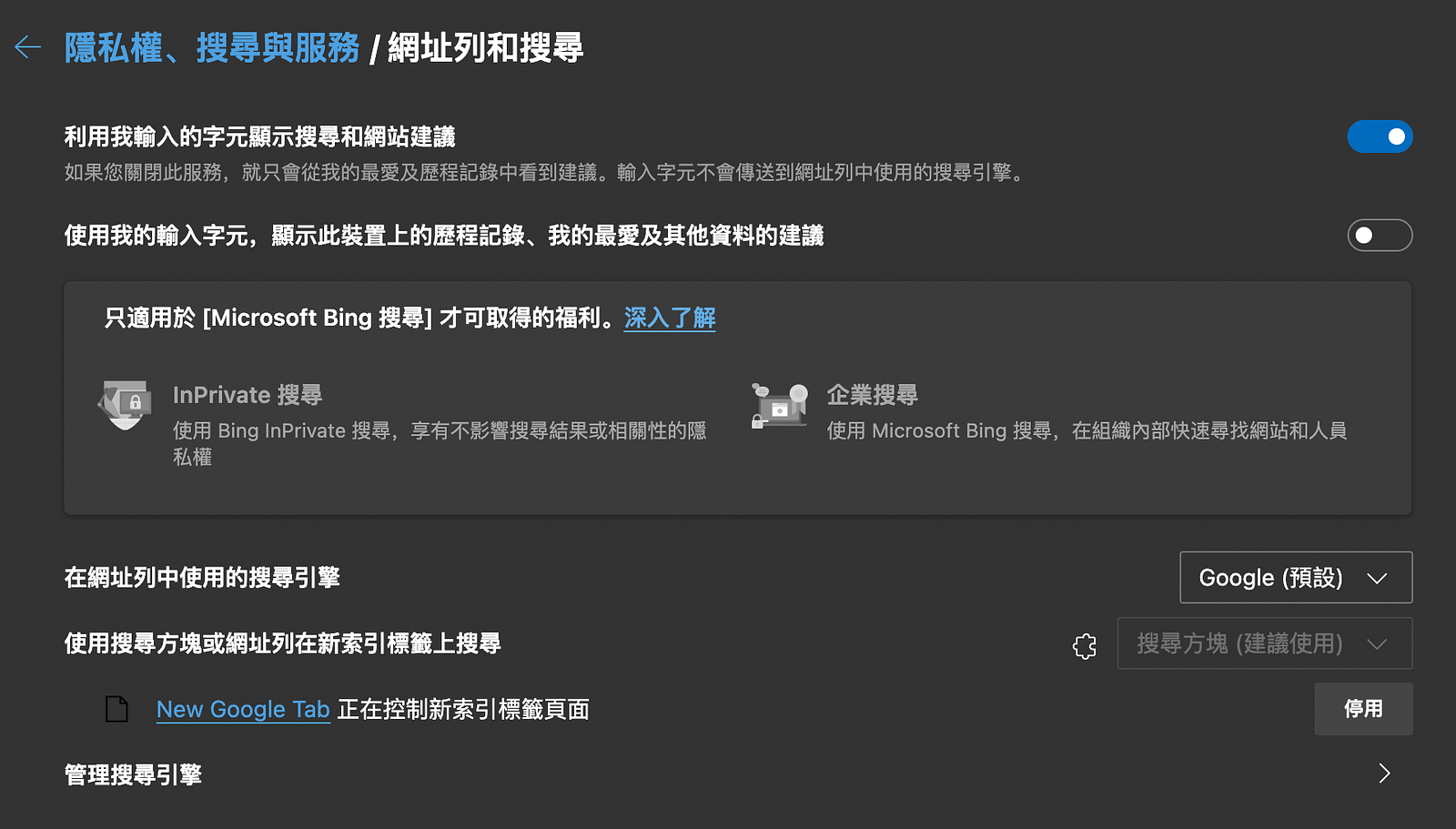 Edge 分頁及網址列預設的搜尋引擎都是微軟自家Bing,要換成google,先打開 設定 > [隱私權、搜尋與服務] > 點擊最下面[網址列和搜尋] >